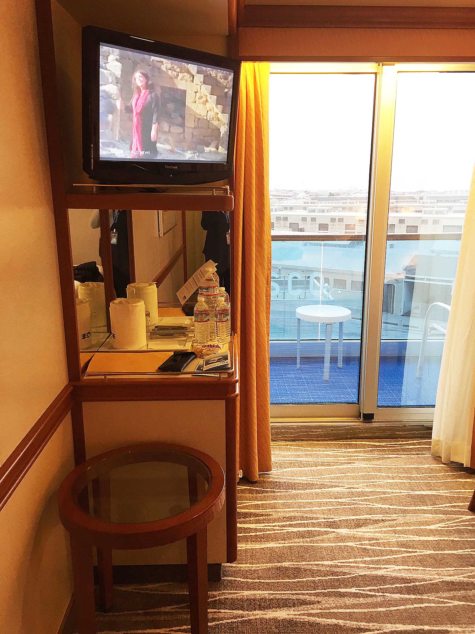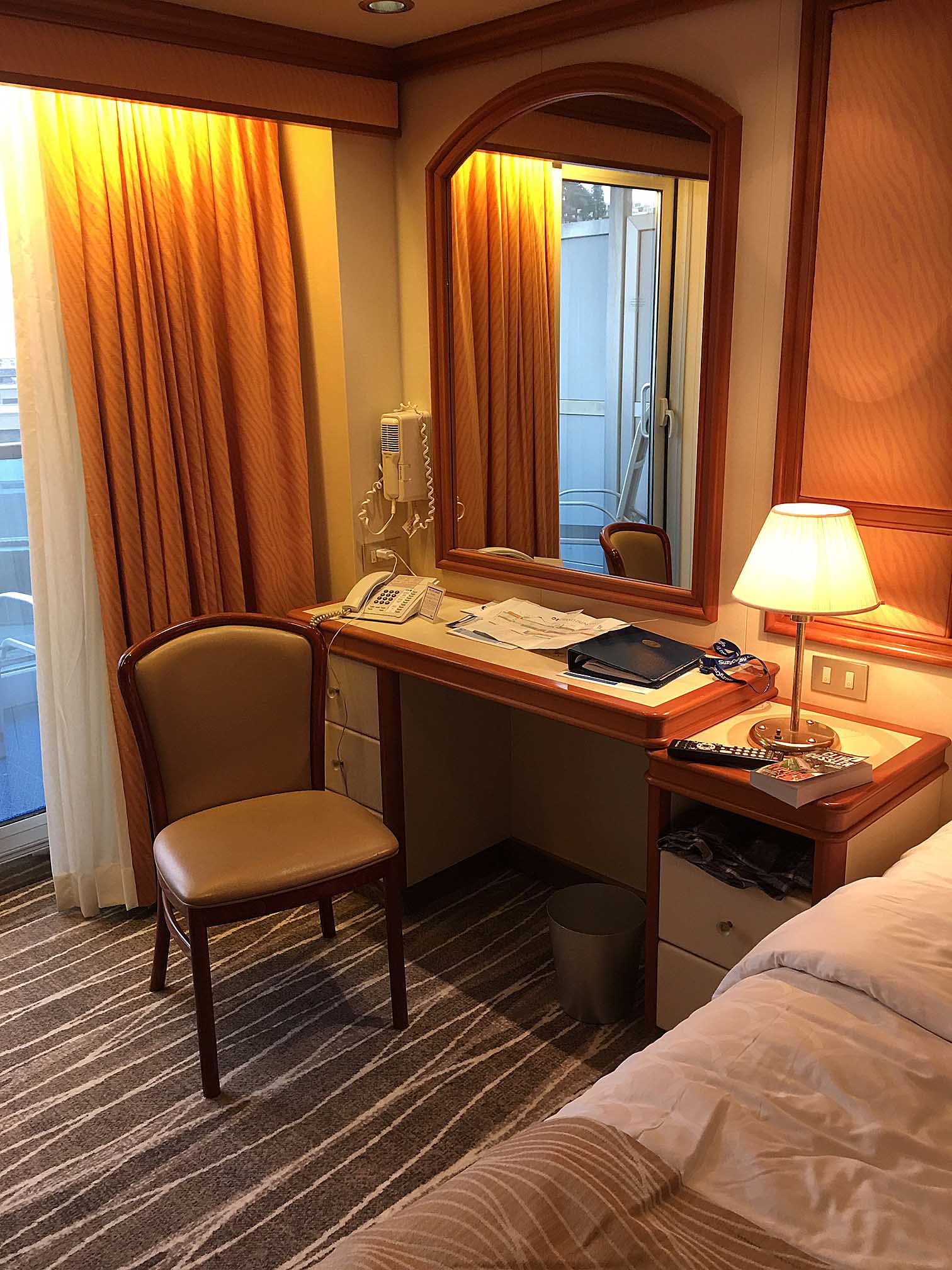 the sliding glass door to the balcony, the hair dryer/blower over the desk, the cabin phone, and bed which